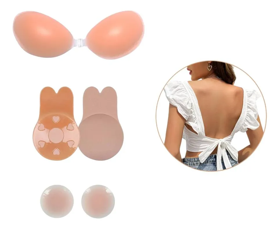 Set Corpiño Pezoneras Silicona Y Conejito Invisible Adhesivo